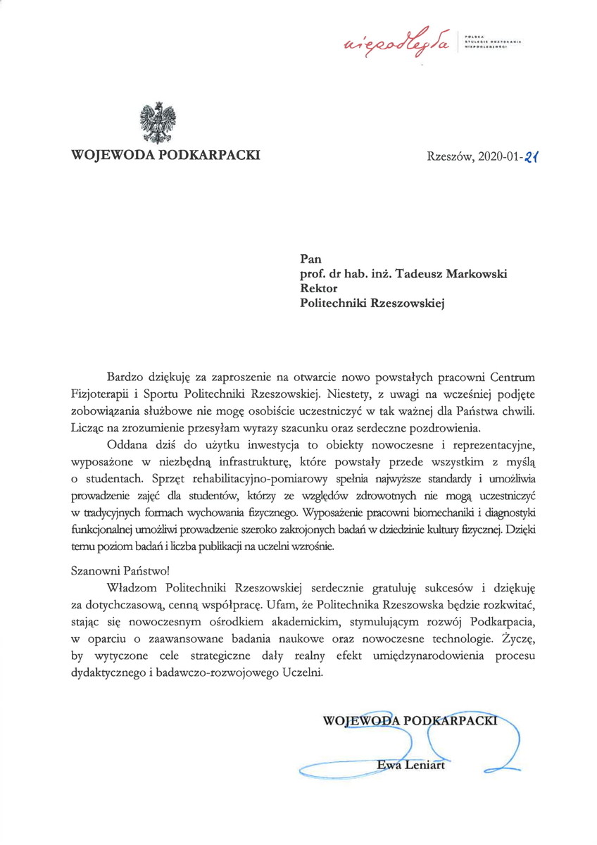 Otwarcia dokonał Rektor Politechniki Rzeszowskiej prof. dr hab. inż. Tadeusz Markowski. -Oddajemy dziś do użytku miejsce, które służyć będzie usprawnieniu ruchowemu studentów, którzy z uwagi na stan zdrowia nie są w stanie uczestniczyć w tradycyjnych formach wychowania fizycznego. Alternatywne formy zajęć WF-u są wprawdzie prowadzone w naszej Uczelni od ponad 30 lat, jednak Uczelnia się rozrasta - a co za tym idzie - z roku na rok przybywa studentów przebywających na długoterminowych  zwolnieniach lekarskich oraz studentów z niepełnosprawnościami. Podyktowało to konieczność rozbudowy specjalistycznej pracowni dedykowanej tej grupie studentów - powiedział prof. Markowski.