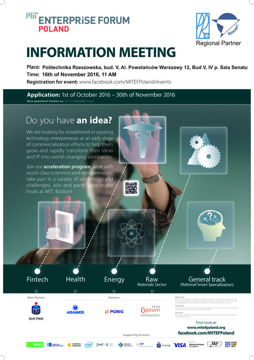 16 listopada 2016 roku o godz. 11.00 na Politechnice Rzeszowskiej zespół Massachusetts Institute of Technology Enterprise Forum (MITEF) zaprezentuje twórcom start-upów technologicznych, w jaki sposób program akceleracji, opracowany przez ekspertów Massachusetts Institute of Technology (MIT), pomaga polskim start-upom dostać się na globalne rynki.