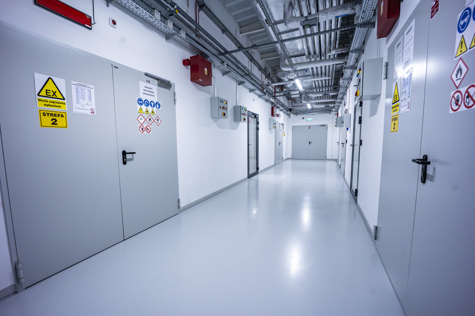 Szczególnym miejscem jest pomieszczenie przeznaczone do przechowywania nadtlenków organicznych, w całości objęte strefą zagrożenia wybuchem Ex 2. Zastosowane rozwiązania techniczne, procedury oraz urządzenia spełniają wymagania dyrektywy ATEX. Oddzielne pomieszczenie przeznaczono również do magazynowania odpadów biologicznych – tzw. cold room, w którym stała niska temperatura skutecznie ogranicza rozwój patogenów.