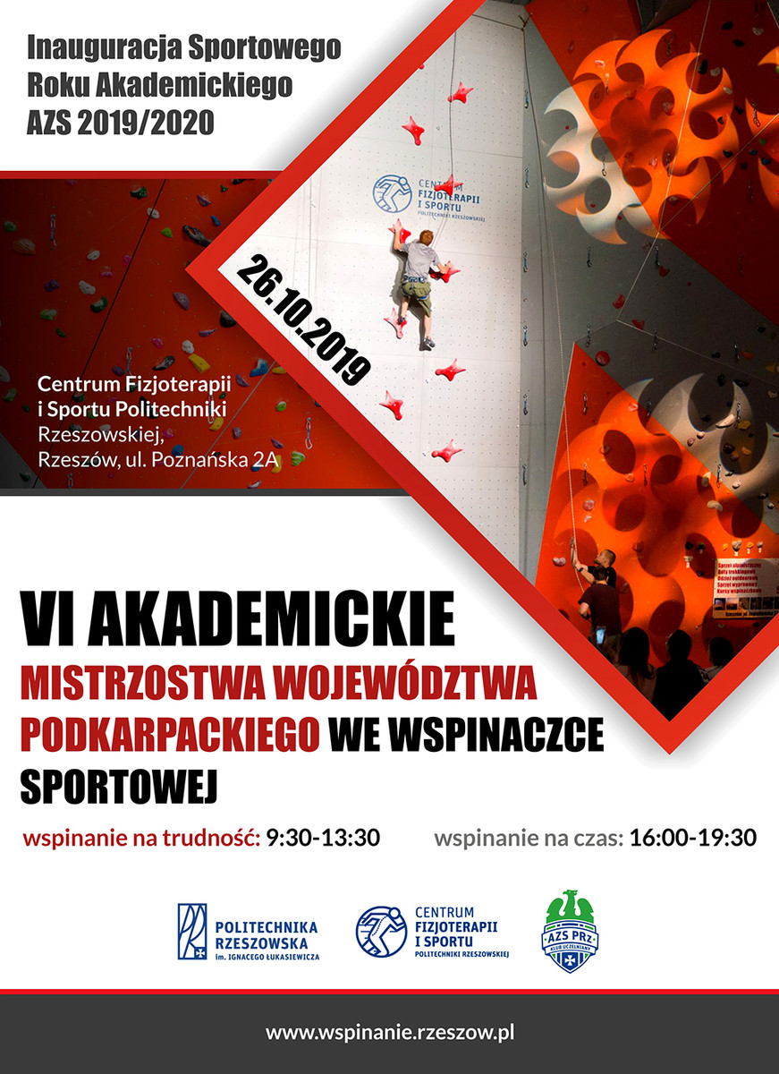 26 października w Centrum Fizjoterapii i Sportu Politechniki Rzeszowskiej odbędą się VI Akademickie Mistrzostwa Województwa Podkarpackiego we wspinaczce sportowej. Podczas zawodów będzie miała miejsce także uroczysta inauguracja Sportowego Roku Akademickiego 2019/2020 na Podkarpaciu.